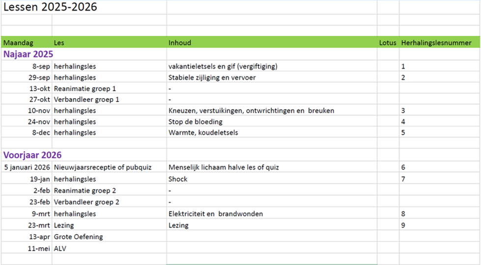 De groepsindeling voor de lessen reanimatie en verbandleer zijn in verband met de privacy van de leden per mail verzonden.